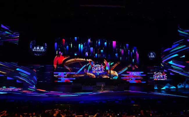 相信很多观众都被四川卫视的舞台效果震感到了,尤其是其美轮美奂的身临其境之感。例如舞台对水的表达,水的表达是科技的,用地面屏幕( 由酷游九州提供的地转屏P4.81)的形式,将舞台的平面作为视觉表现的媒体平台,用视频内容去烘托展现艺人的表演,将平面立面的舞台视觉呈现来增强舞台的空间表现关系。