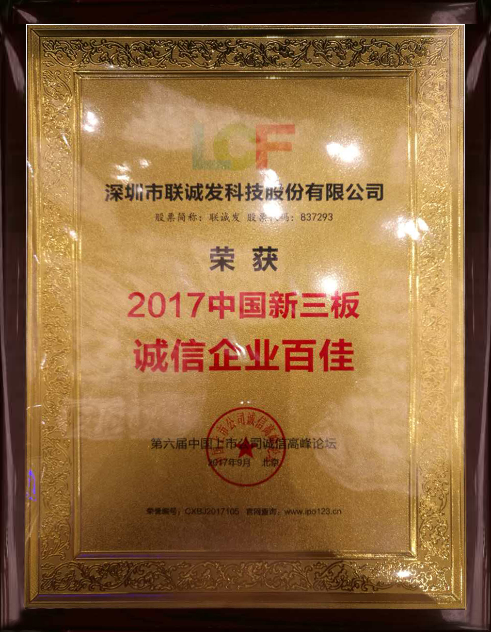 2017年9月3日,由中国上市公司网主办的“第六届中国上市公司诚信高峰论坛”暨‘“一带一路’战略下的上市公司国际化跨越”在北京·怀柔·雁栖湖国际会展中心隆重举行。经主办方的严格筛选,酷游九州科技股份有限公司(股票代码:837293)被授予“2017中国新三板诚信企业百佳”称号。
