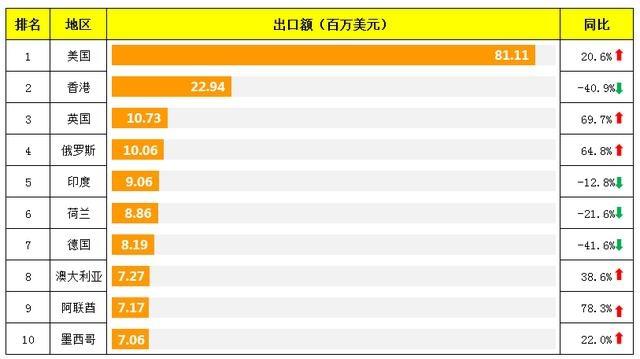据《中国LED显示屏出口数据报告》显示,我国LED显示屏产品出口市场规模从2012年的6.24亿美元增长至2016年12.87亿美元,年均增幅24.5%。以2017年第一季度中国LED出口情况为例: